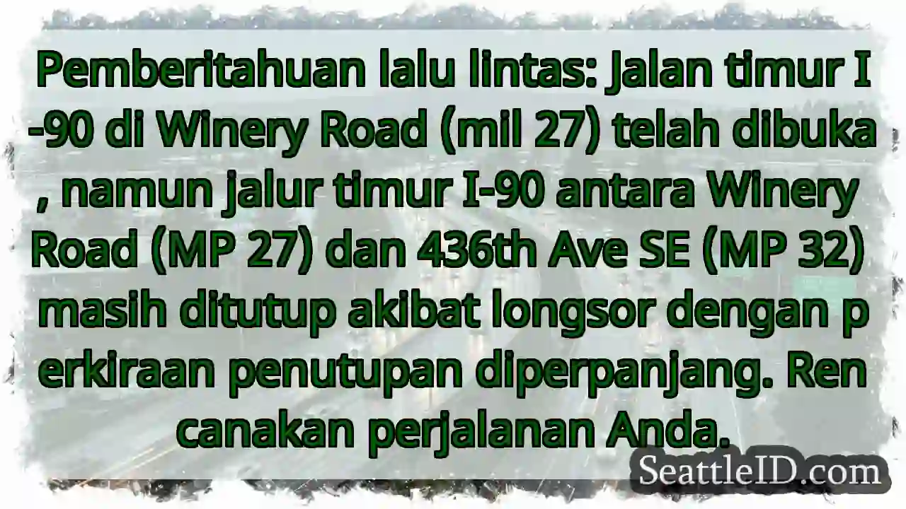 Pemberitahuan lalu lintas: Jalan timur I-90 di Winery Road (mil 27) telah dibuka, namun jalur timur I-90 antara Winery Road (MP 27) dan 436th Ave SE (MP 32) masih ditutup akibat longsor dengan perkiraan penutupan diperpanjang. Rencanakan perjalanan Anda.