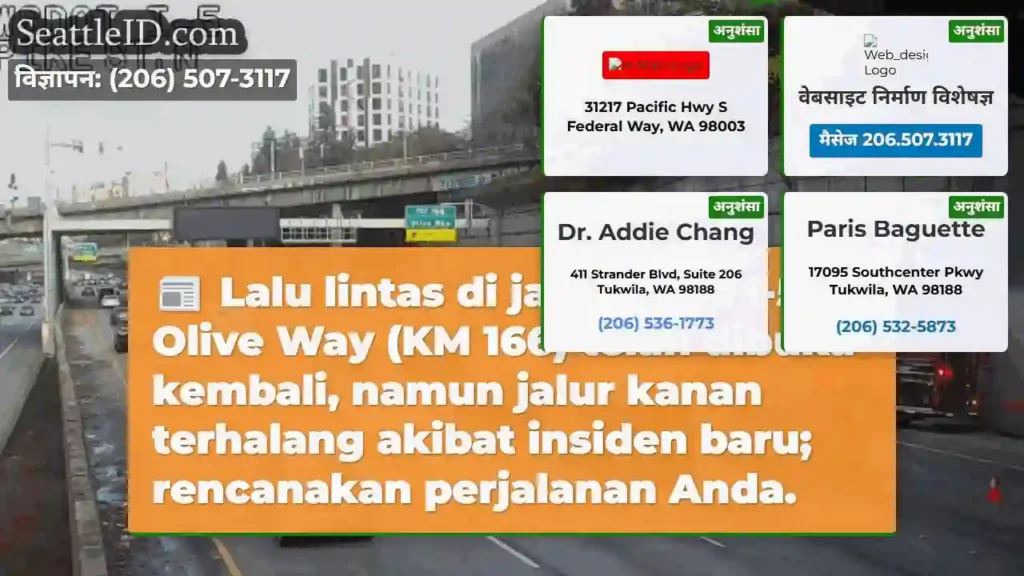 Lalu lintas di jalur utara I-5 di Olive Way (KM 166) telah dibuka kembali, namun jalur kanan terhalang akibat insiden baru; rencanakan perjalanan Anda.