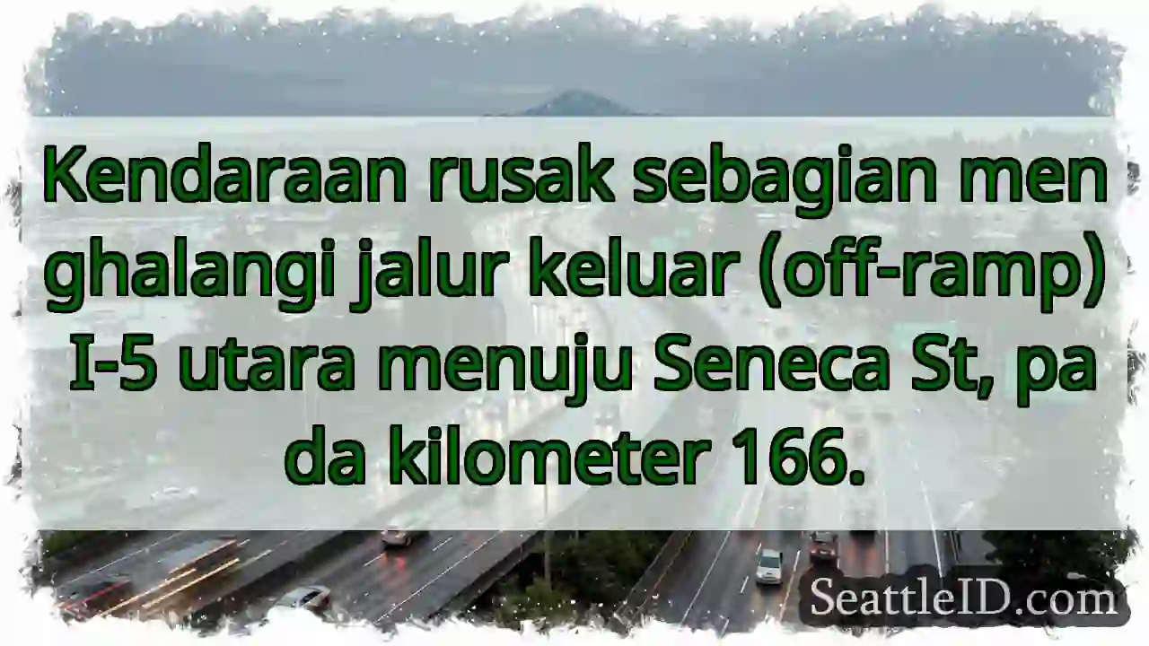 Kendaraan rusak sebagian menghalangi jalur keluar (off-ramp) I-5 utara menuju Seneca St, pada kilometer 166.