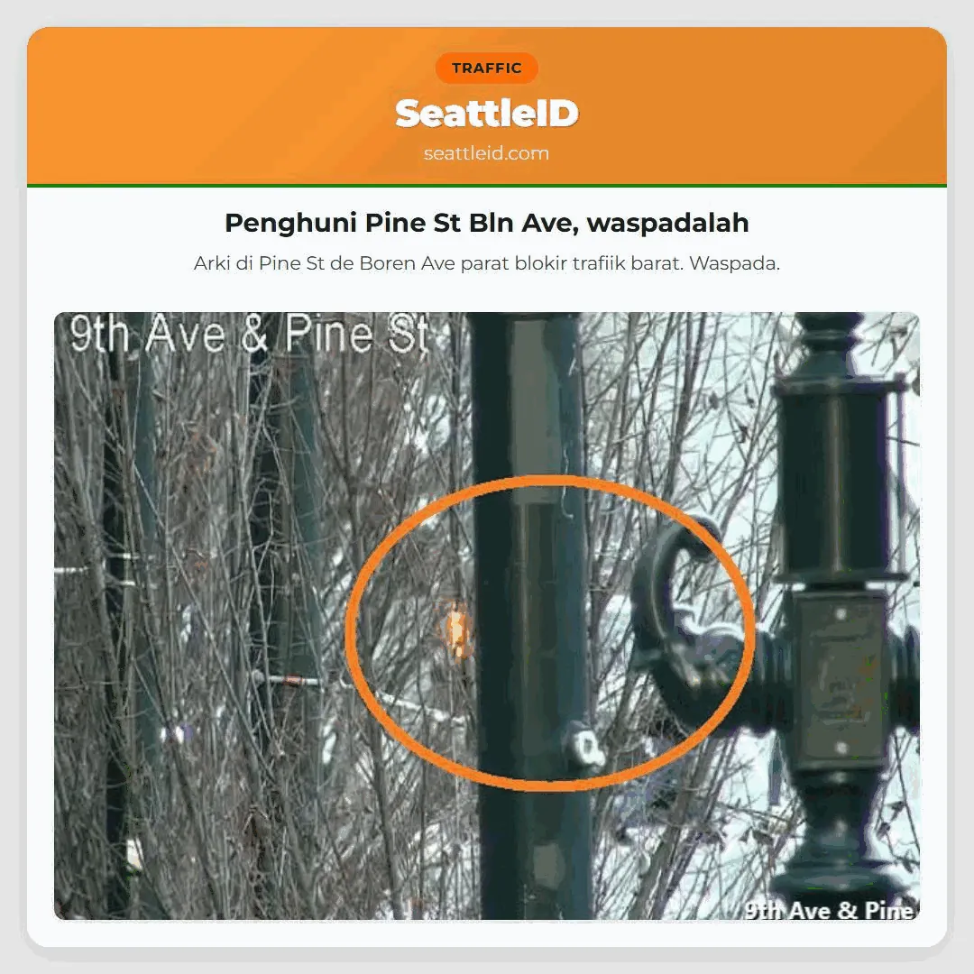 09/02/2026 17:01 Seattle traffic Penghuni Pine St Bln Ave, waspadalah Penghuni Pine St Bln Ave, waspadalah Arki di Pine St de Boren Ave parat blokir trafiik barat. Waspada. ताजा खबर Olympisten metsissä Washingtonissa [SR-9 NB] SR 9 NB @ SR 524 (MP 2) kiri ada tabung [SR-99 NB] NB & SB lanes closed tonight [SR-527 NB] Kollision NB SR 527 near 196th St SE [I-5 NB] Kecelakaan di SR 518, blokir kiri [I-90 WB] 50W east Rainier Ave S, lane block.