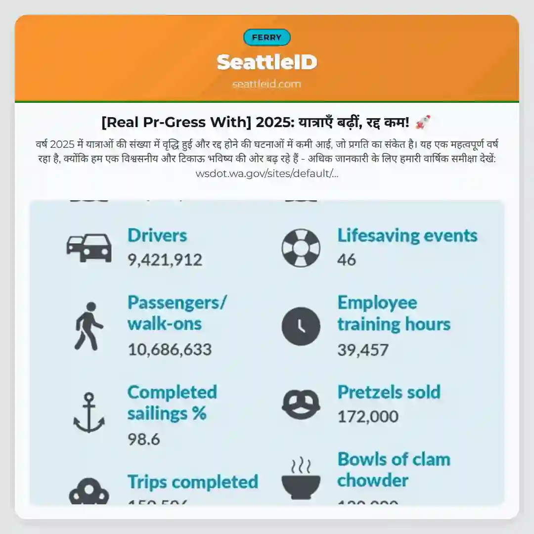 वर्ष 2025 में यात्राओं की संख्या में वृद्धि हुई और रद्द होने की घटनाओं में कमी आई, जो प्रगति का संकेत है। यह एक महत्वपूर्ण वर्ष रहा है, क्योंकि हम एक विश्वसनीय और टिकाऊ भविष्य की ओर बढ़ रहे हैं – अधिक जानकारी के लिए हमारी वार्षिक समीक्षा देखें: wsdot.wa.gov/sites/default/…