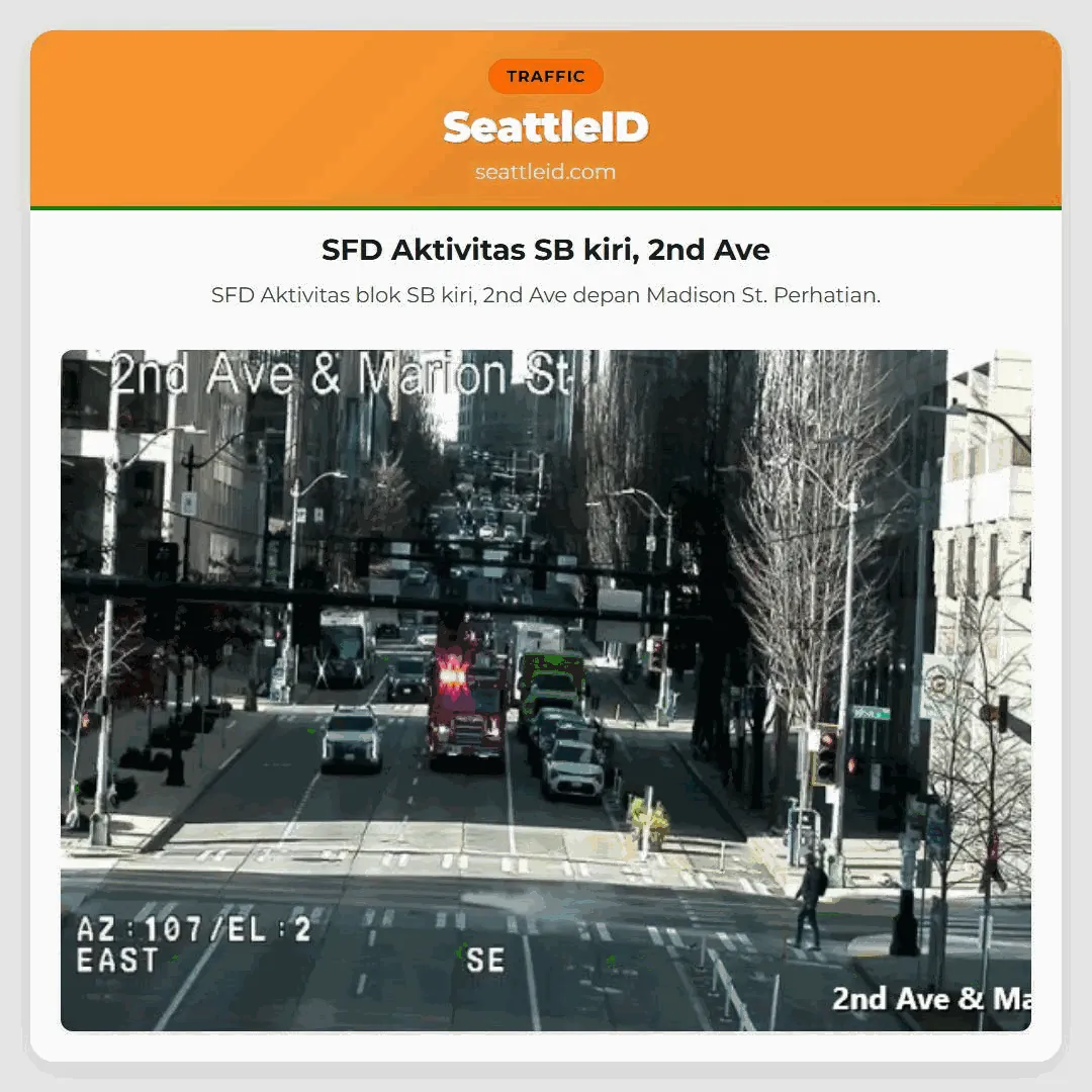 10/02/2026 15:10 Seattle traffic SFD Aktivitas SB kiri, 2nd Ave SFD Aktivitas SB kiri, 2nd Ave SFD Aktivitas blok SB kiri, 2nd Ave depan Madison St. Perhatian. ताजा खबर [Fauntleroy-Vashon-Southworth] Cathlamet Back on Schedule [I-5 NB] 5 NB ends at 164th St SW [SR-9 NB] Kecelakaan SR9 N, SR204 (MP16) Szukamy podejrzanego! [I-5 NB] Kairėje langelyje blockuojantis atkarpas Baca blog ini