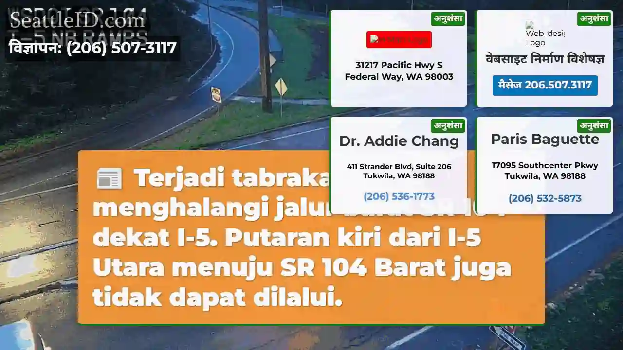 Terjadi tabrakan yang menghalangi jalur barat SR 104 dekat I-5. Putaran kiri dari I-5 Utara menuju SR 104 Barat juga tidak dapat dilalui.