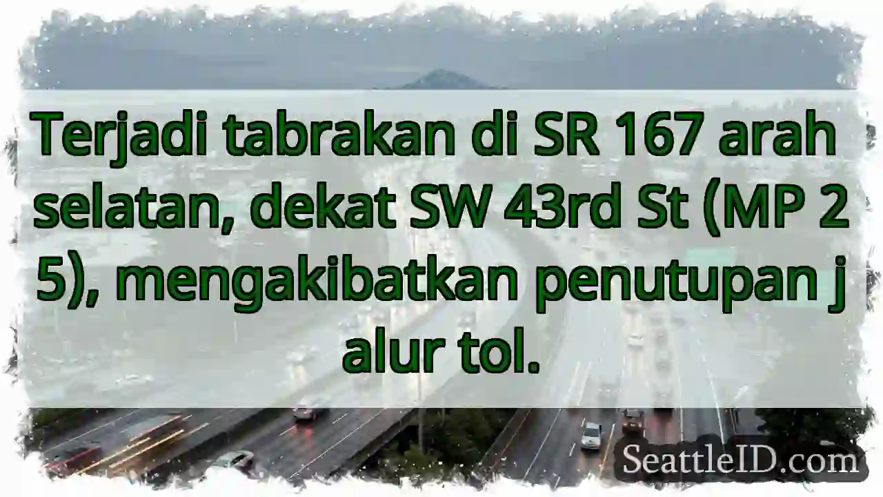 09/12/2025 17:15 Seattle traffic SR 167 Ditutup! Arah Selatan. SR 167 Ditutup! Arah Selatan. Terjadi tabrakan di SR 167 arah selatan, dekat SW 43rd St (MP 25), mengakibatkan penutupan jalur tol. ताजा खबर Mogok di I-405 Selatan. Lalu lintas tersendat! SR 99 Ditutup! Lalu Lintas Perahu. Macet I-5 Utara: Kendaraan Mogok! Tabrakan I-5 Selatan. Jalur HOV ditutup. Mogok di I-405 Selatan! Kendara hindari jalur Tabrakan I-5 Selatan: Jalur Kiri & HOV Terblokir