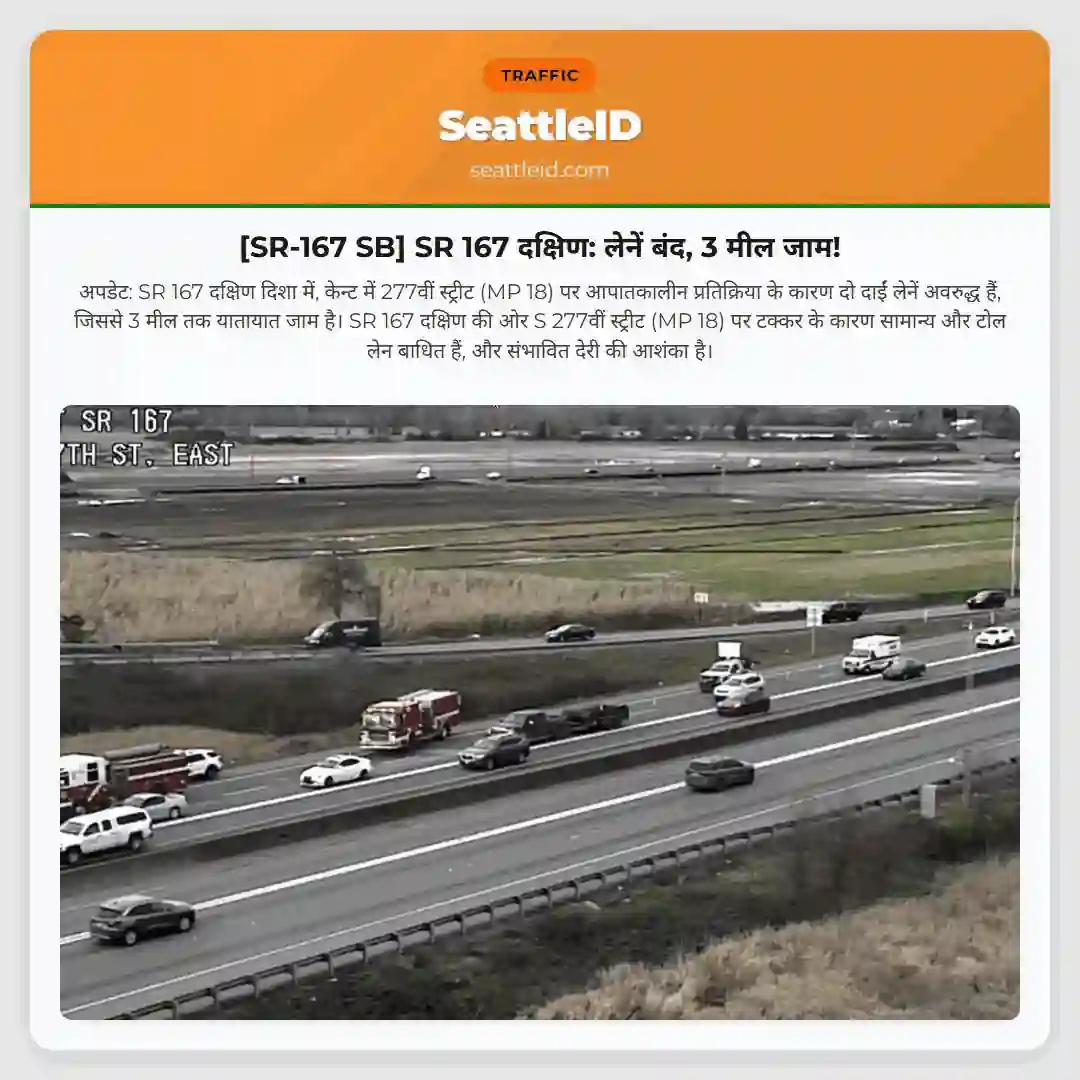 अपडेट: SR 167 दक्षिण दिशा में, केन्ट में 277वीं स्ट्रीट (MP 18) पर आपातकालीन प्रतिक्रिया के कारण दो दाईं लेनें अवरुद्ध हैं, जिससे 3 मील तक यातायात जाम है। SR 167 दक्षिण की ओर S 277वीं स्ट्रीट (MP 18) पर टक्कर के कारण सामान्य और टोल लेन बाधित हैं, और संभावित देरी की आशंका है।