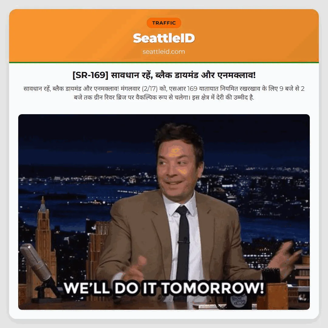 मंगलवार (2/17) को, एसआर 169 यातायात नियमित रखरखाव के लिए 9 बजे से 2 बजे तक ग्रीन रिवर ब्रिज पर वैकल्पिक रूप से चलेगा।