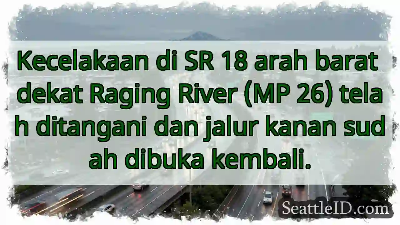 Kecelakaan di SR 18 arah barat dekat Raging River (MP 26) telah ditangani dan jalur kanan sudah dibuka kembali.