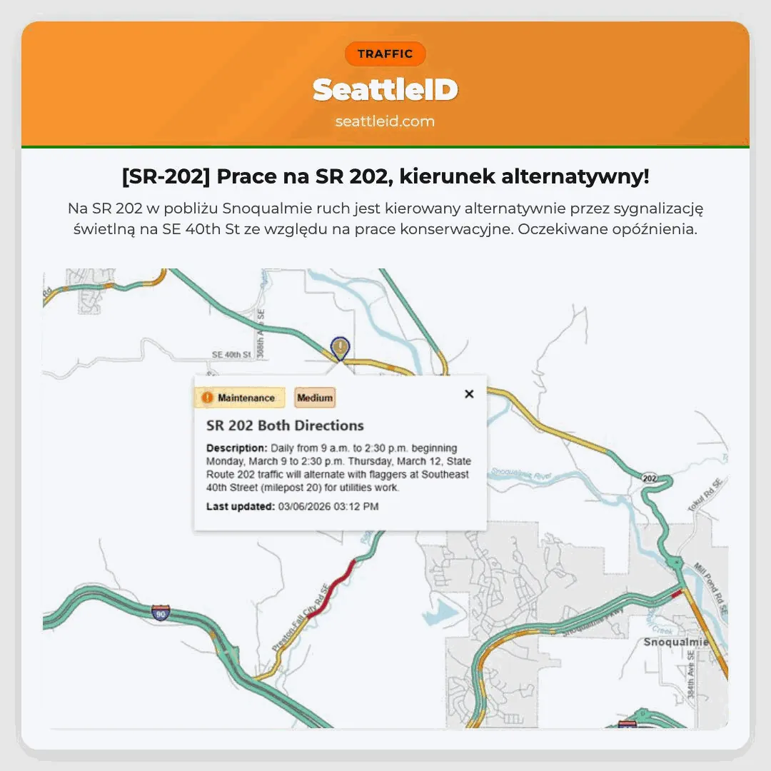 Na SR 202 w pobliżu Snoqualmie ruch jest kierowany alternatywnie przez sygnalizację świetlną na SE 40th St ze względu na prace konserwacyjne. Oczekiwane opóźnienia.
