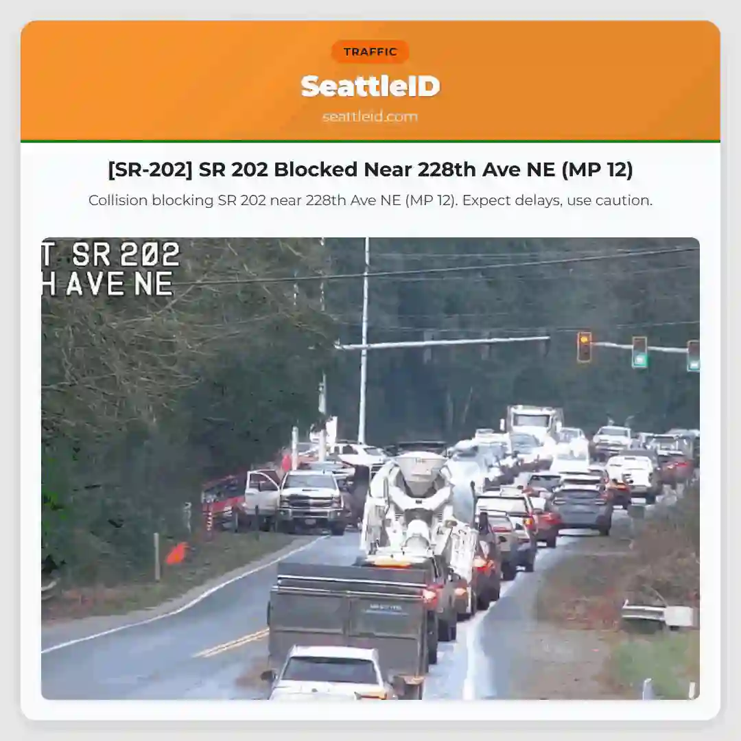27/01/2026 08:34 Seattle traffic [SR-202] SR 202 Blocked Near 228th Ave NE (MP 12) SR 202 Blocked Near 228th Ave NE (MP 12) Collision blocking SR 202 near 228th Ave NE (MP 12). Expect delays, use caution. ताजा खबर [SR-202] SR 202 Blocked Near 228th Ave NE (MP 12) [SR-202 EB] SR-202 EB at 228th Ave NE (MP 12) – Collision [Fauntleroy-Vashon-Southworth] फांट/वीए/एसडब्ल्यू – अपडेट – एडीए अलर्ट – कैथलमेट [I-405] साफ़: तुकविला में एसआर 181 (एमपी 1) पर एसबी [Anacortes-San Juans] Ana/SJs: Ferry suspended today (Jan 27) [I-405] I-405 SB/SR181 (MP1) – Collision. Lane blocked.