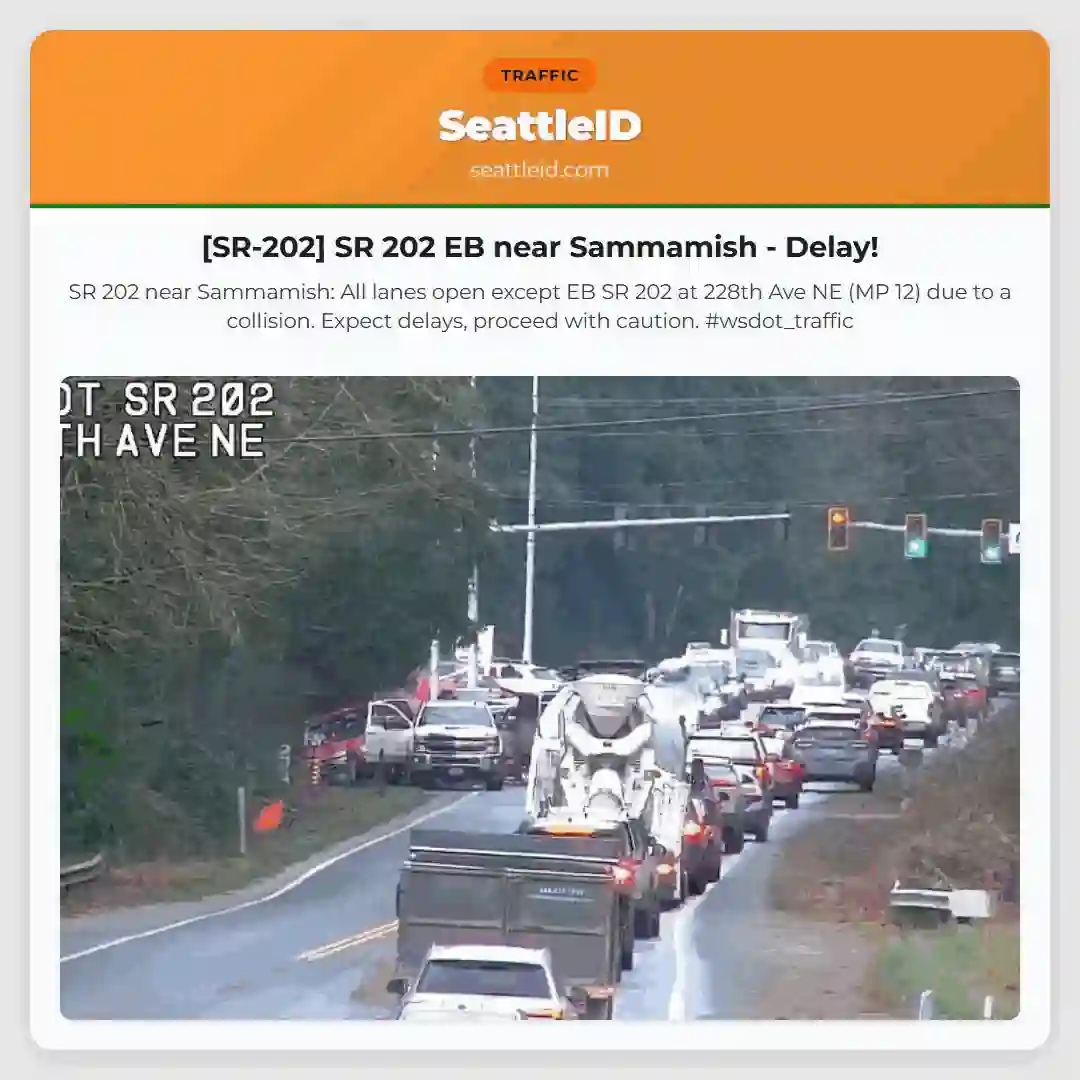 SR 202 near Sammamish: All lanes open except EB SR 202 at 228th Ave NE (MP 12) due to a collision. Expect delays, proceed with caution. #wsdot_traffic
