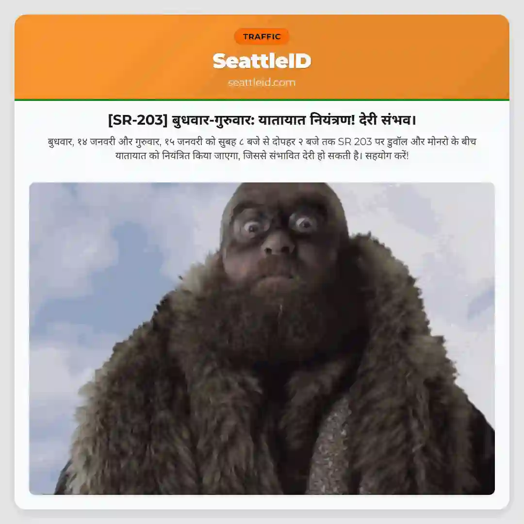बुधवार, १४ जनवरी और गुरुवार, १५ जनवरी को सुबह ८ बजे से दोपहर २ बजे तक SR 203 पर डुवॉल और मोनरो के बीच यातायात को नियंत्रित किया जाएगा, जिससे संभावित देरी हो सकती है। सहयोग करें!