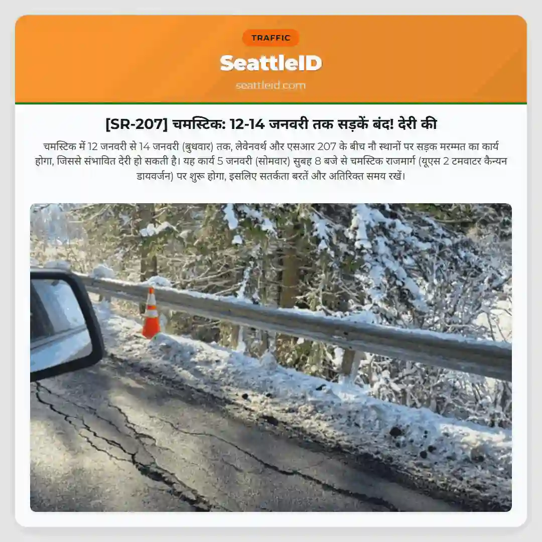 चमस्टिक में 12 जनवरी से 14 जनवरी (बुधवार) तक, लेवेनवर्थ और एसआर 207 के बीच नौ स्थानों पर सड़क मरम्मत का कार्य होगा, जिससे संभावित देरी हो सकती है। यह कार्य 5 जनवरी (सोमवार) सुबह 8 बजे से चमस्टिक राजमार्ग (यूएस 2 टमवाटर कैन्यन डायवर्जन) पर शुरू होगा, इसलिए सतर्कता बरतें और अतिरिक्त समय रखें।