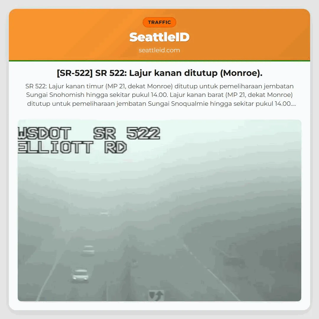 SR 522: Lajur kanan timur (MP 21, dekat Monroe) ditutup untuk pemeliharaan jembatan Sungai Snohomish hingga sekitar pukul 14.00. Lajur kanan barat (MP 21, dekat Monroe) ditutup untuk pemeliharaan jembatan Sungai Snoqualmie hingga sekitar pukul 14.00. Antisipasi penundaan.