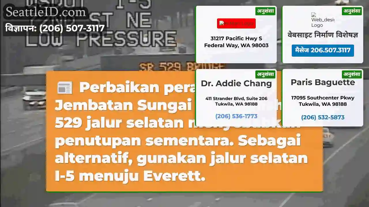 Perbaikan peralatan di Jembatan Sungai Snohomish SR 529 jalur selatan menyebabkan penutupan sementara. Sebagai alternatif, gunakan jalur selatan I-5 menuju Everett.