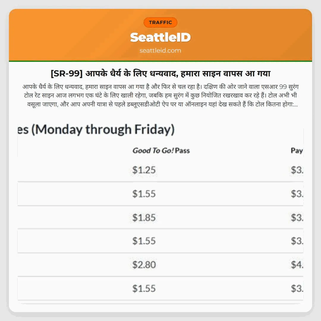 आपके धैर्य के लिए धन्यवाद, हमारा साइन वापस आ गया है और फिर से चल रहा है। दक्षिण की ओर जाने वाला एसआर 99 सुरंग टोल रेट साइन आज लगभग एक घंटे के लिए खाली रहेगा, जबकि हम सुरंग में कुछ नियोजित रखरखाव कर रहे हैं।