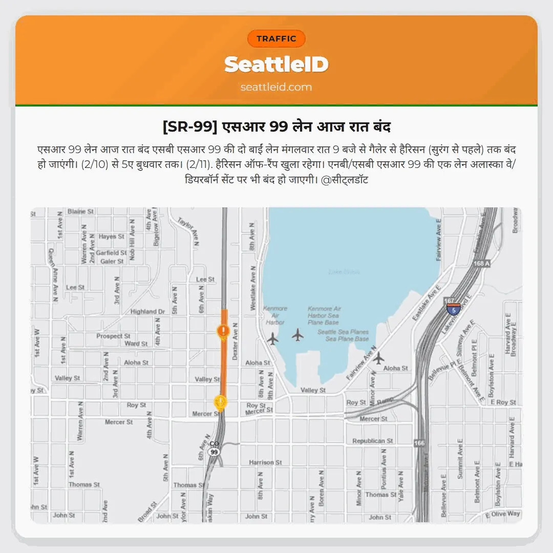एनबी/एसबी एसआर 99 की एक लेन अलास्का वे/डियरबॉर्न सेंट पर भी बंद हो जाएगी।