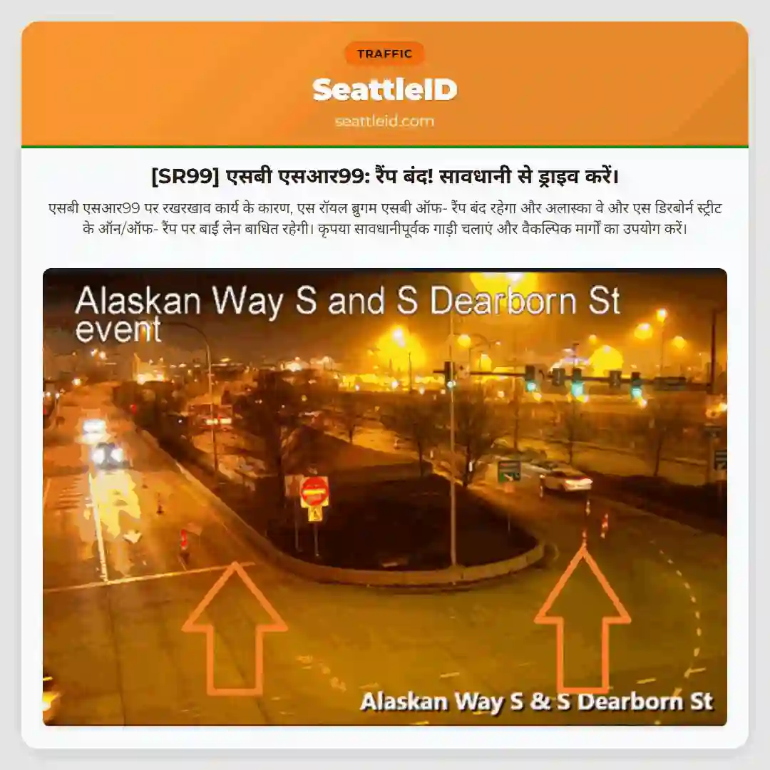 एसबी एसआर99 पर रखरखाव कार्य के कारण, एस रॉयल ब्रुगम एसबी ऑफ- रैंप बंद रहेगा और अलास्का वे और एस डिरबोर्न स्ट्रीट के ऑन/ऑफ- रैंप पर बाईं लेन बाधित रहेगी। कृपया सावधानीपूर्वक गाड़ी चलाएं और वैकल्पिक मार्गों का उपयोग करें।