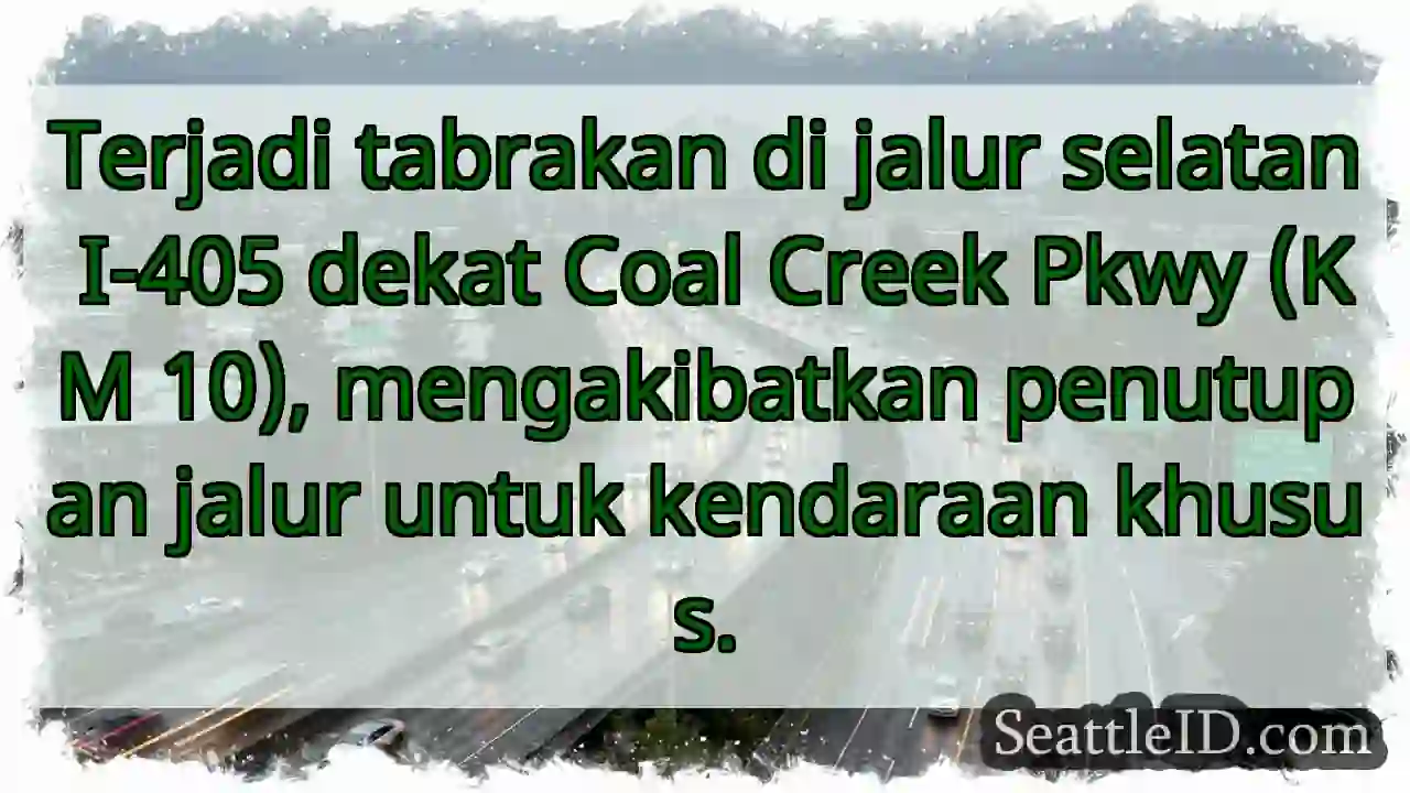 Terjadi tabrakan di jalur selatan I-405 dekat Coal Creek Pkwy (KM 10), mengakibatkan penutupan jalur untuk kendaraan khusus.