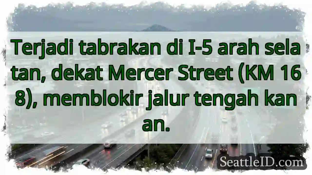 07/12/2025 15:15 Seattle traffic Tabrakan I-5 Selatan! Blokir jalur tengah kanan. Tabrakan I-5 Selatan! Blokir jalur tengah kanan. Terjadi tabrakan di I-5 arah selatan, dekat Mercer Street (KM 168), memblokir jalur tengah kanan. ताजा खबर I-5 Utara: Jalur Kanan Ditutup! सिएटल में भारी वर्षा की चेतावनी बाढ़ का खतरा और उच्च ज्वार की संभावना Sinyal kiri bermasalah! Hati-hati! Tabrakan I-5 Selatan! Blokir jalur tengah kanan. Jadwal Feri Desember! Cek Tabrakan HOV I-5 Utara. Macet!