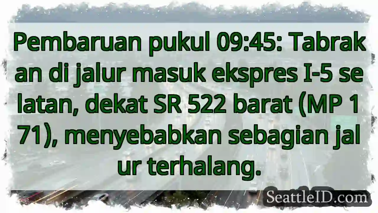 Pembaruan pukul 09:45: Tabrakan di jalur masuk ekspres I-5 selatan, dekat SR 522 barat (MP 171), menyebabkan sebagian jalur terhalang.