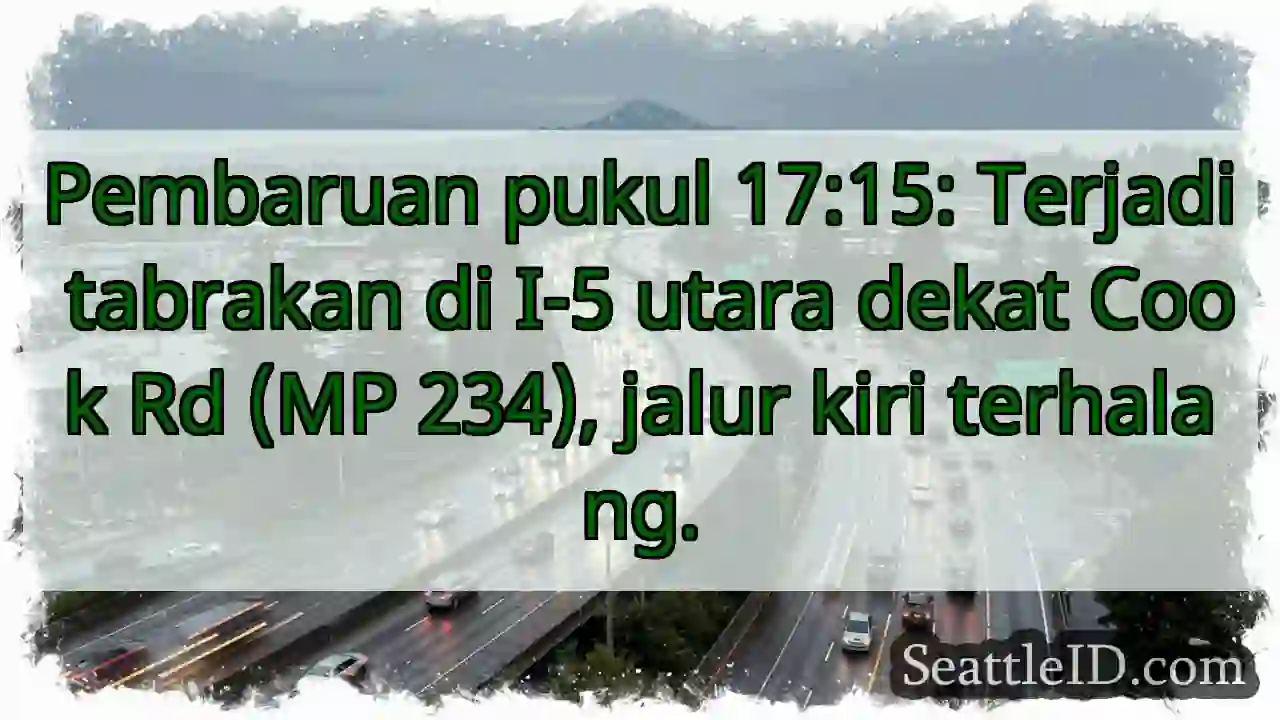 09/12/2025 17:20 Seattle traffic Tabrakan I-5 Utara! Jalur Kiri Terhalang Tabrakan I-5 Utara! Jalur Kiri Terhalang Pembaruan pukul 17:15: Terjadi tabrakan di I-5 utara dekat Cook Rd (MP 234), jalur kiri terhalang. ताजा खबर Tabrakan I-5 Selatan. Jalur Kanan Terblokir. Tabrakan I-5 Utara! Jalur Kiri Terhalang SR 167 Ditutup! Arah Selatan. SR 520 Barat: Kendaraan Mogok, Lalu Lintas Padat Banjir! Waspada cuaca buruk di Barat Washington. Lalu lintas I-90 Timur Terganggu!