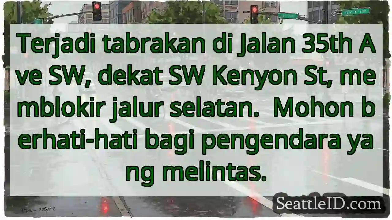 Terjadi tabrakan di Jalan 35th Ave SW, dekat SW Kenyon St, memblokir jalur selatan. Mohon berhati-hati bagi pengendara yang melintas.
