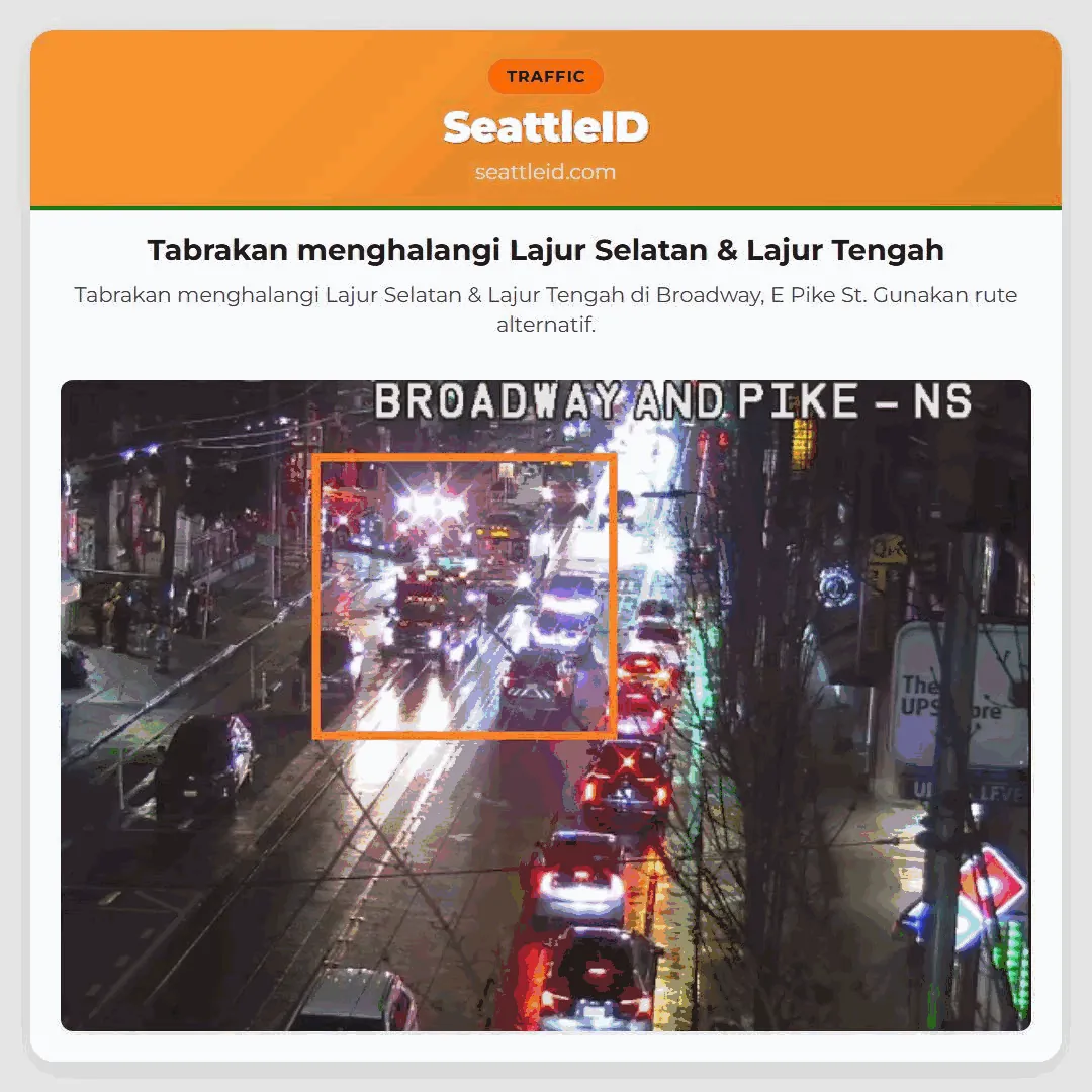 Tabrakan menghalangi Lajur Selatan & Lajur Tengah di Broadway, E Pike St. Gunakan rute alternatif.