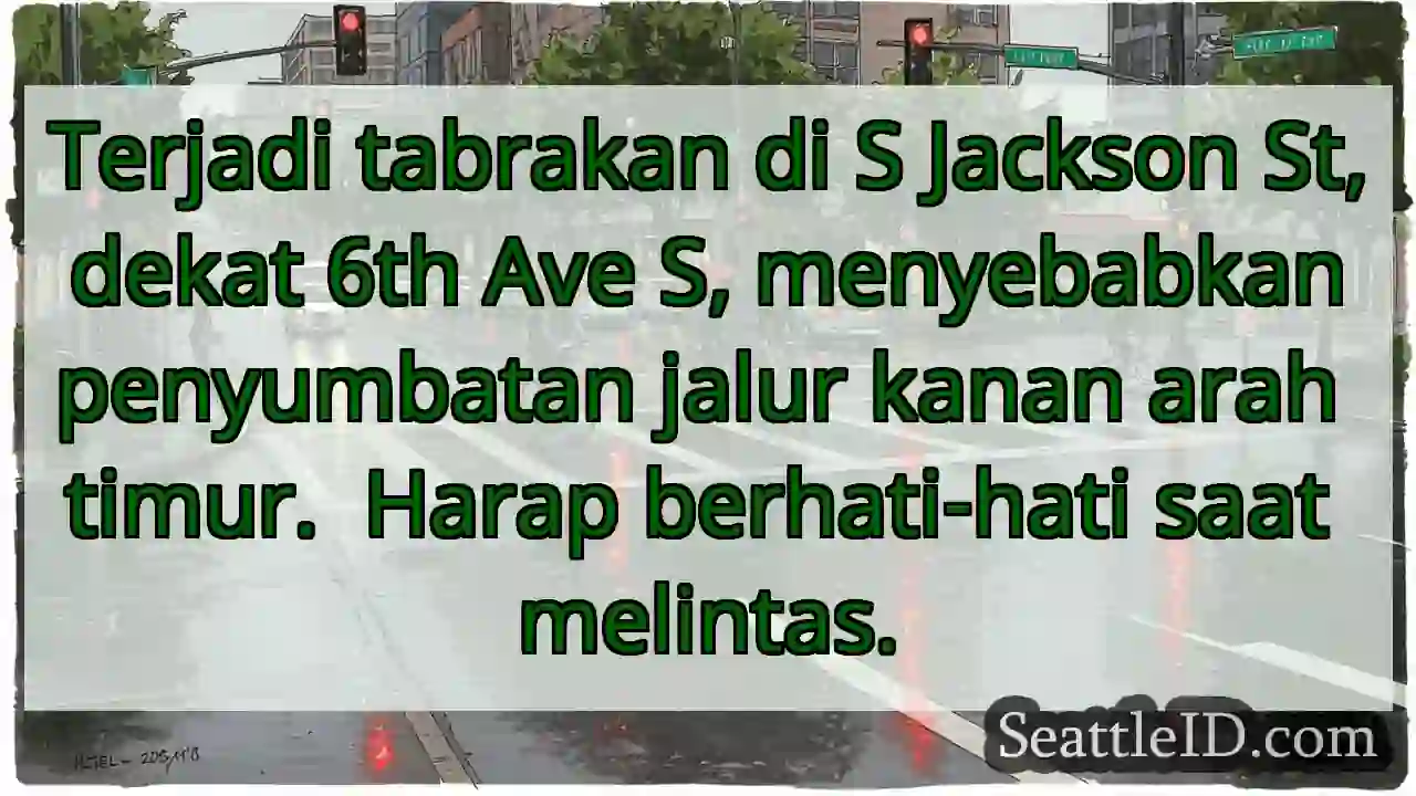 Terjadi tabrakan di S Jackson St, dekat 6th Ave S, menyebabkan penyumbatan jalur kanan arah timur. Harap berhati-hati saat melintas.