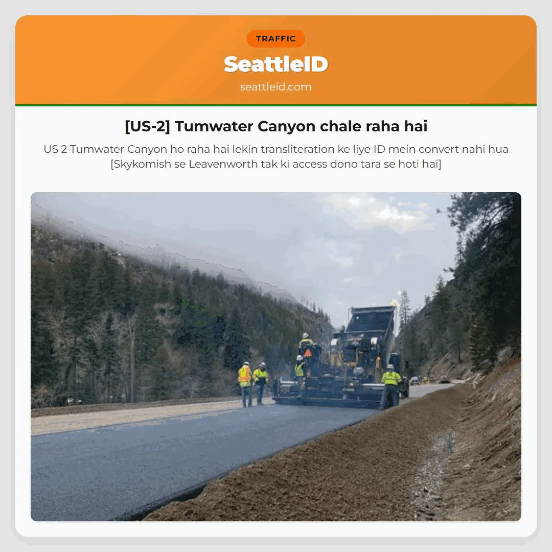 US 2 Tumwater Canyon ho raha hai lekin transliteration ke liye ID mein convert nahi hua [Skykomish se Leavenworth tak ki access dono tara se hoti hai]