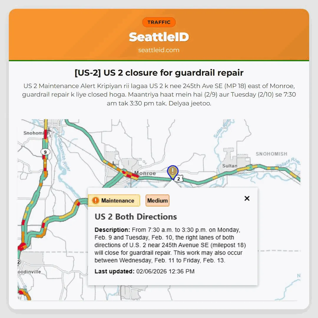 Kripiyan rii lagaa US 2 k nee 245th Ave SE (MP 18) east of Monroe, guardrail repair k liye closed hoga.