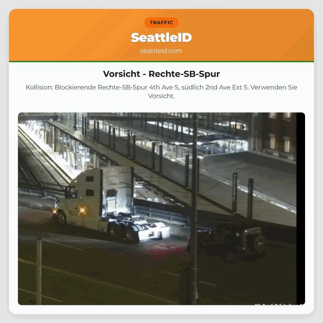 09/02/2026 19:06 Seattle traffic Vorsicht – Rechte-SB-Spur Vorsicht – Rechte-SB-Spur Kollision: Blockierende Rechte-SB-Spur 4th Ave S, südlich 2nd Ave Ext S. Verwenden Sie Vorsicht. ताजा खबर [SR-99 NB] Disabled car right lane ऑबर्न पुलिस विभाग ने कहा कि सोमवार दोपहर तीन [I-5 NB] N of Grandview Rd, right lane blocked. [I-5] [SR 18 w just e of I-5] Vorsicht – Rechte-SB-Spur Olympisten metsissä Washingtonissa